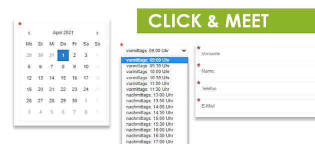 Bei Click & Meet vereinbart der Kunde im Vorfeld einen festen Termin zum Einkaufen in einem bestimmten Laden. Die Terminvereinbarung kann dabei telefonisch oder per E-Mail oder optimalerweise über einen Online-Kalender geschehen.